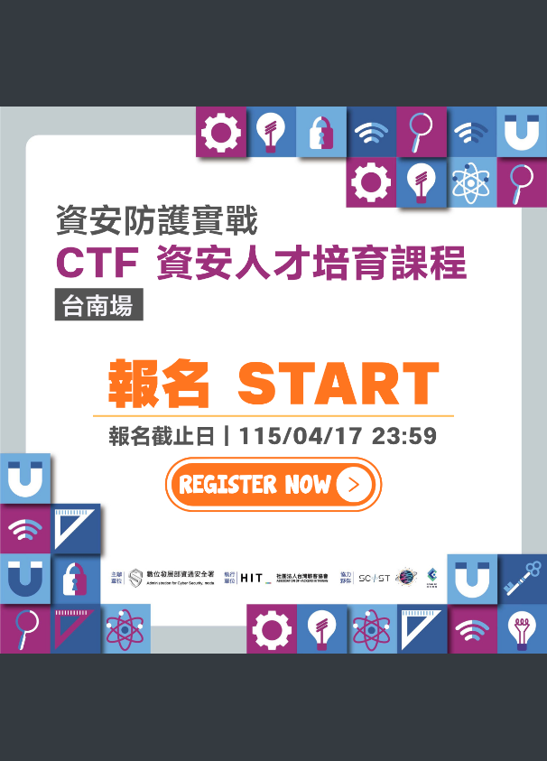 【公告】115年度第1場次CTF資安人才培育課程Post category:圖書館 / 圖書館公告Post author:圖書館員Post published:2026-04-07115年度第1場次CTF資安人才培育課程CTF資安人才培育課程海報 Post Views: 31Read more articles上一篇文章【公告】2026年全民e化資訊運動會下一篇文章【公告】2026全國學生政大運動文學獎