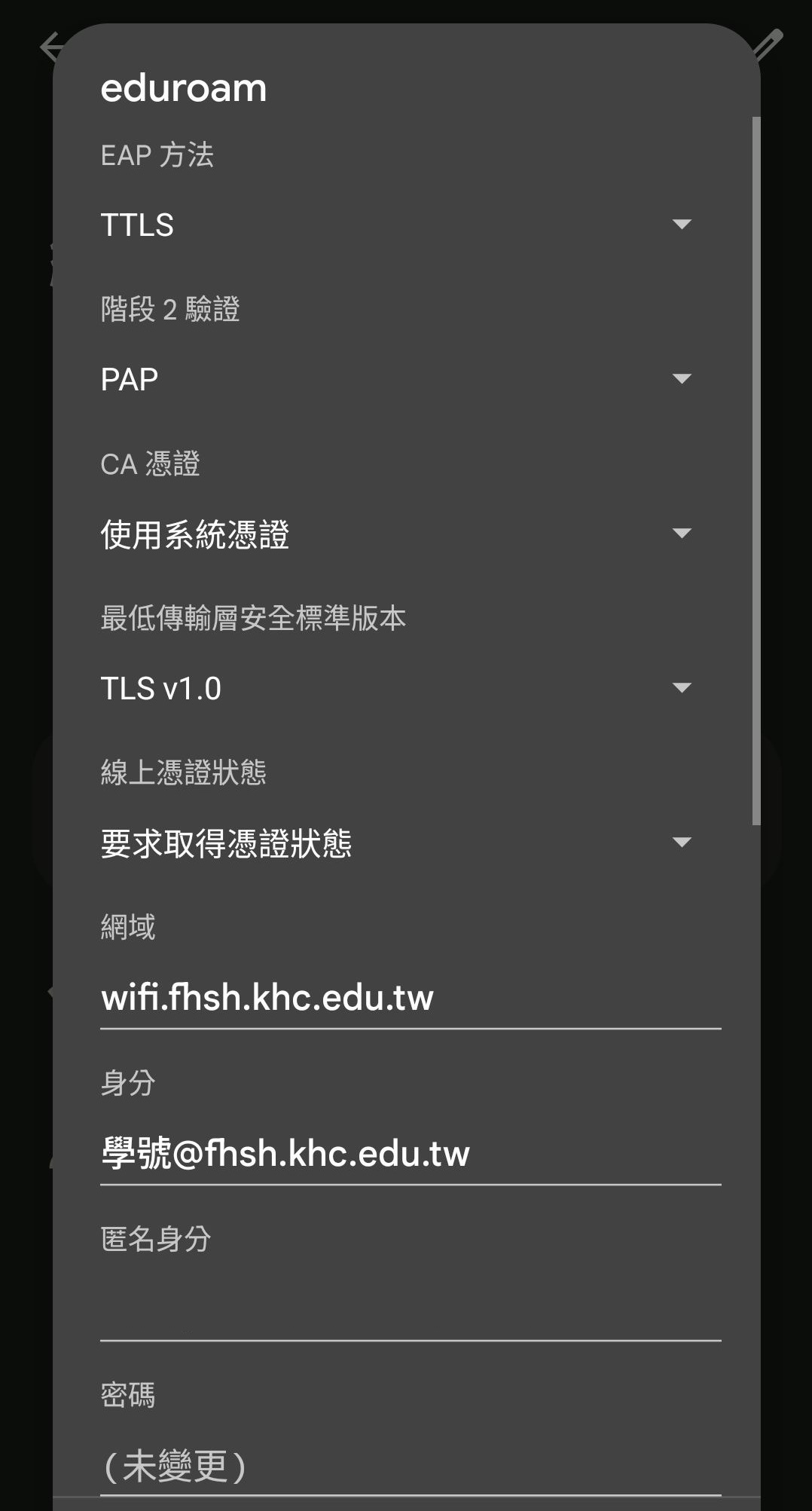 4. 連線eduroam, Fhsh-Eduroam等無線網路訊號時,帳號為學校信箱或教育雲信箱。